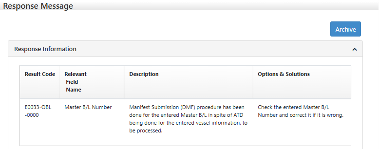 If you receive this error, it means the Master B/L has already been filed under the DMF procedure.