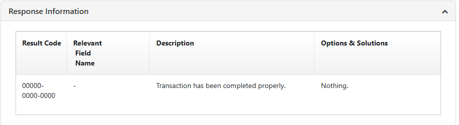 In the response of your transaction, the Result Code will show 00000-0000-0000 with a description "Transaction has completed properly."