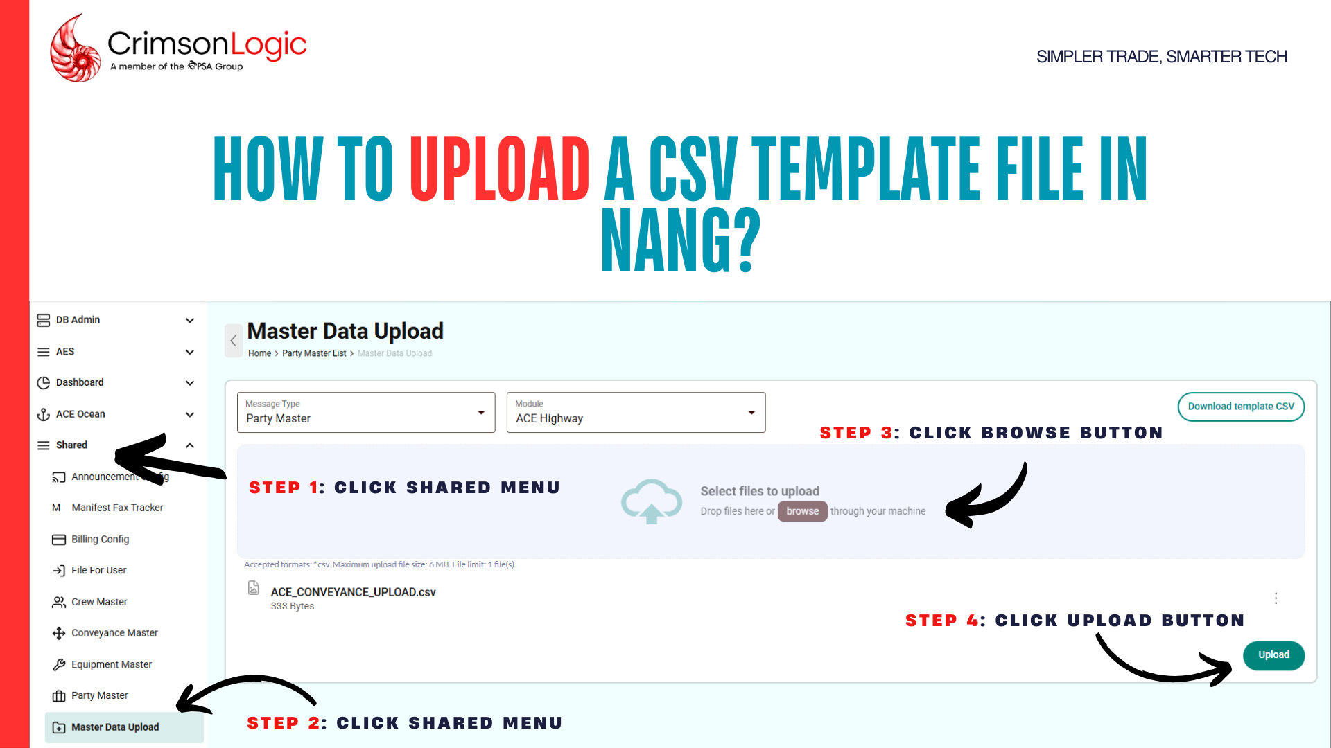 This template allows you to upload party master data (shippers and consignees), drivers, trucks, and trailers all at once, making the bulk upload process easier and more efficient.