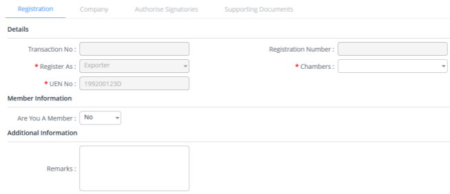 3. Complete the information required in Registration, Company, Authorise Signatories