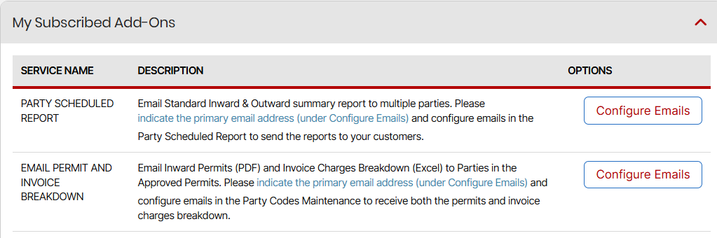 Email Inward Permits (PDF) and Invoice Charges Breakdown (Excel) to Parties in the Approved Permits. Please indicate the primary email address (under Configure Emails) and configure emails in the Party Codes Maintenance to receive both the permits and invoice charges breakdown.